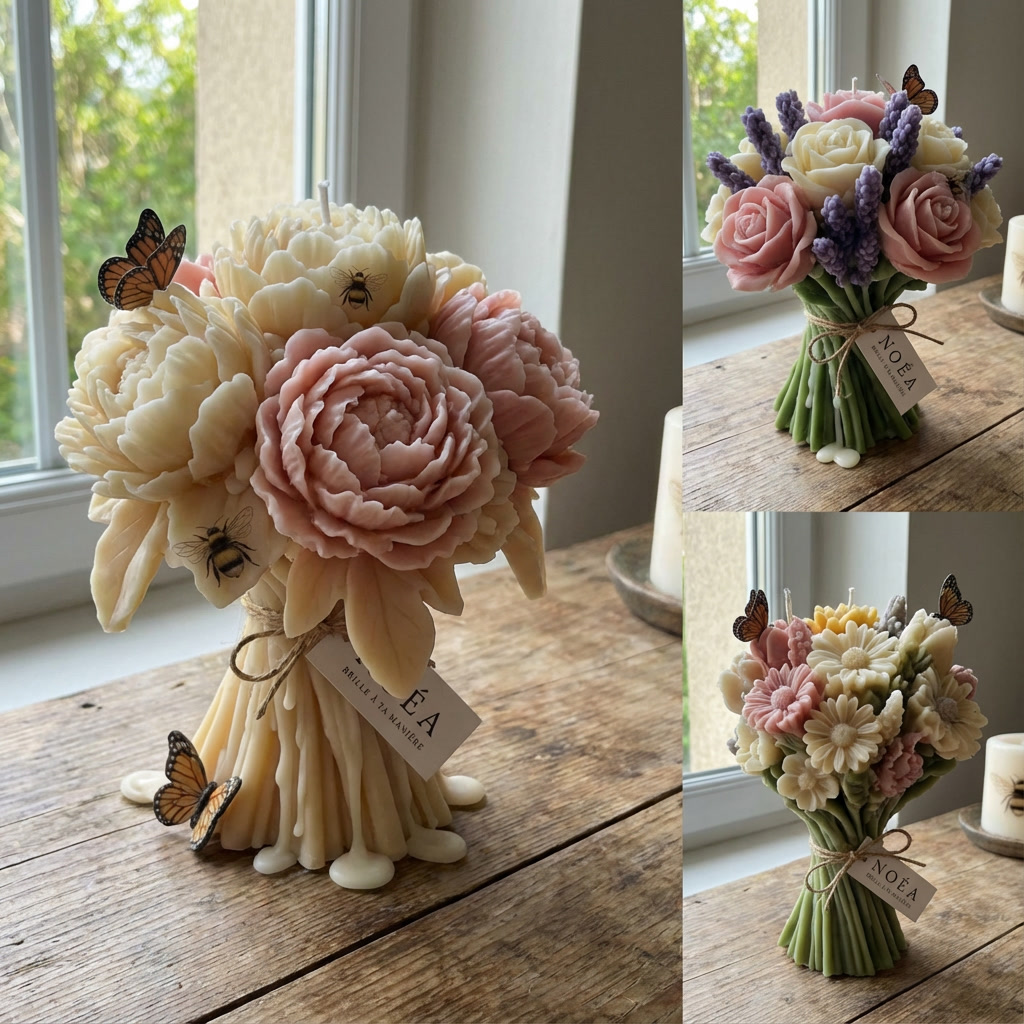 Cette bougie naturelle en forme de bouquet de fleurs est entièrement fabriquée à la main. Chaque détail est soigneusement travaillé pour créer une pièce délicate, à la fois décorative et chaleureuse. Composée de cire naturelle, elle diffuse une ambiance douce et élégante, parfaite pour offrir ou sublimer un intérieur.